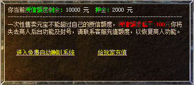 4. 商人不得回收玩家元宝,如有玩家要回收元宝可告知他们联系我们官方回收(防止玩家回收的元宝为盗号所得或黑货来路)