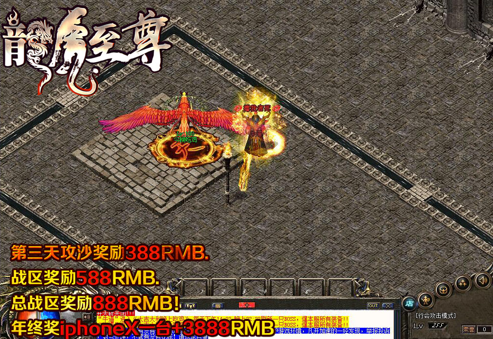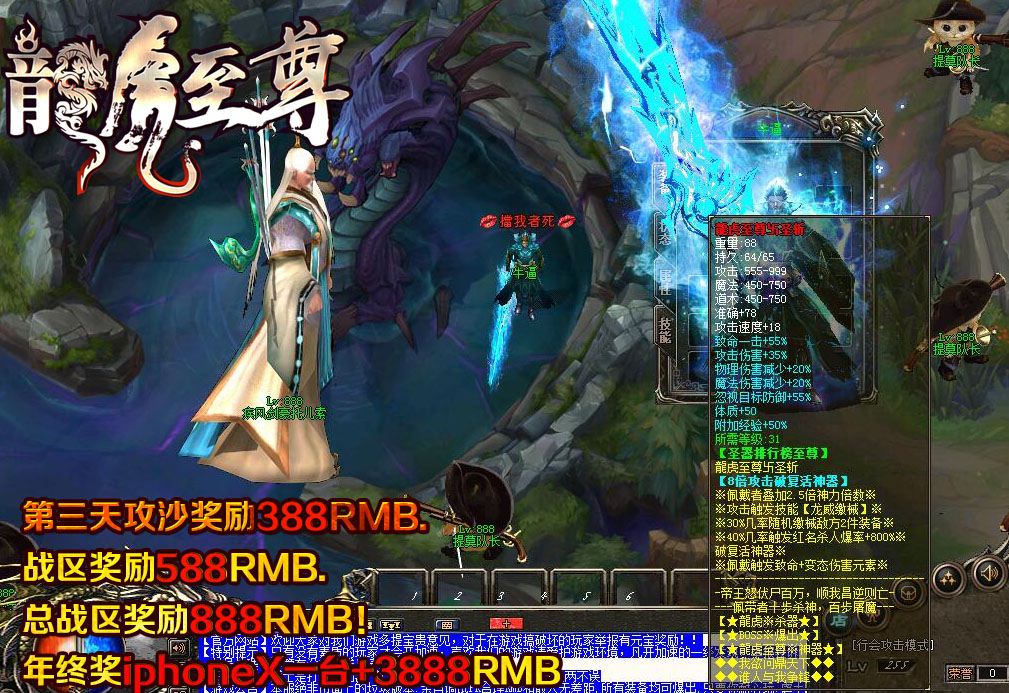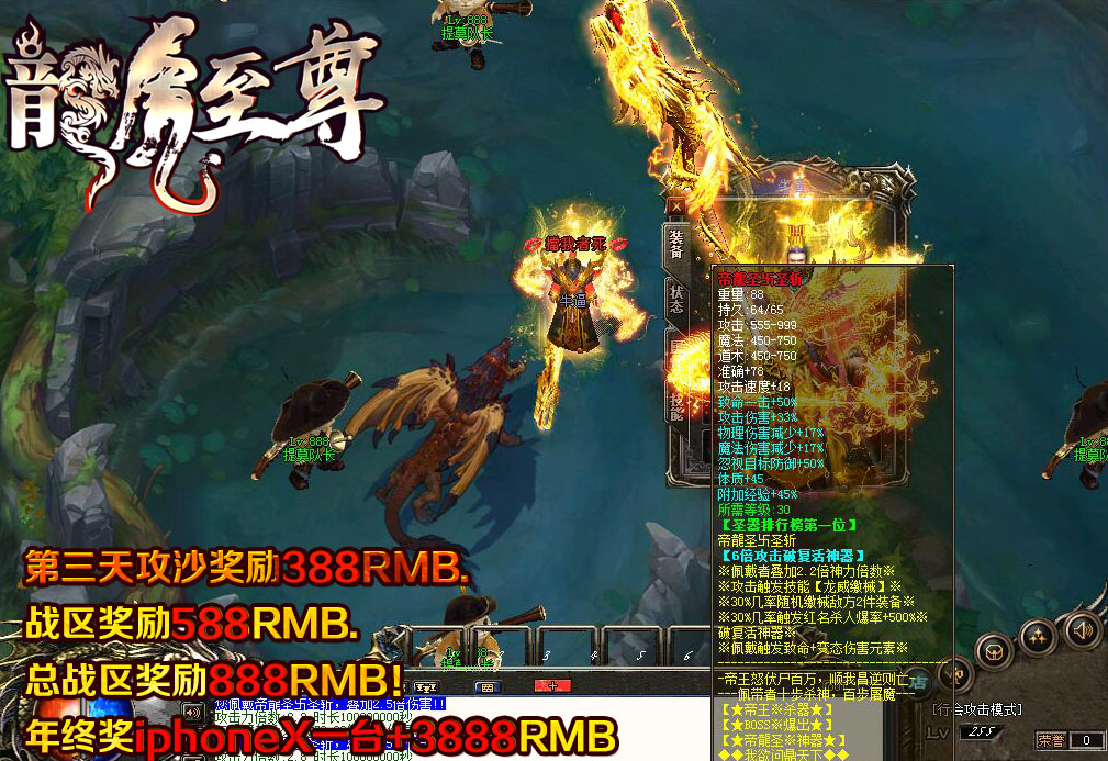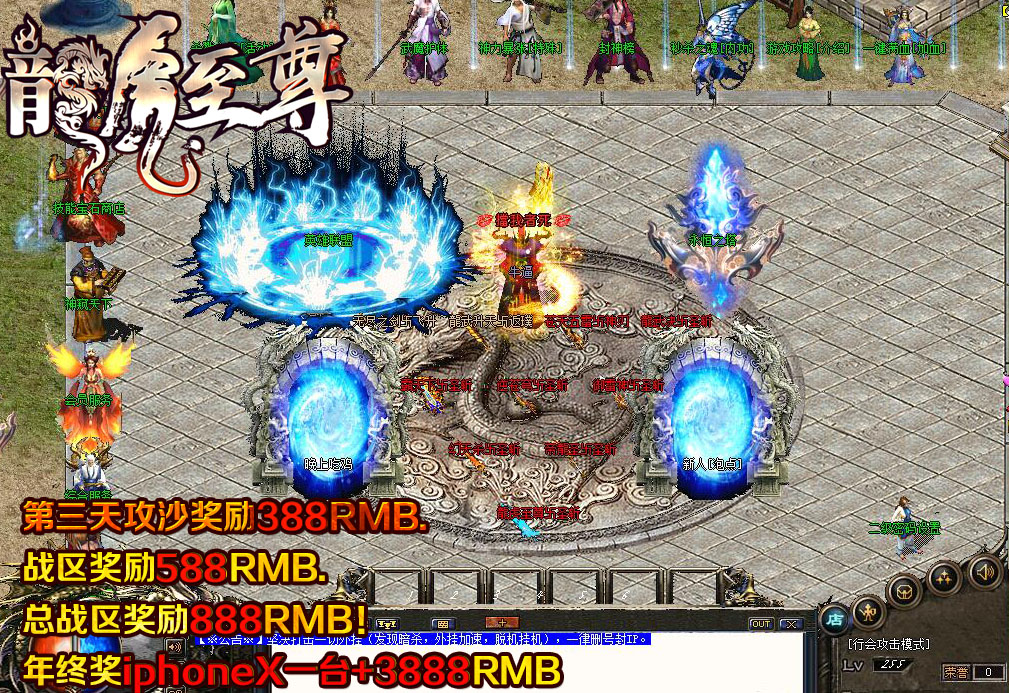 【游戏介绍】:第三天攻沙奖励388RMB.战区奖励588RMB.总战区奖励888RMB!年终奖iphoneX一台+3888RMB