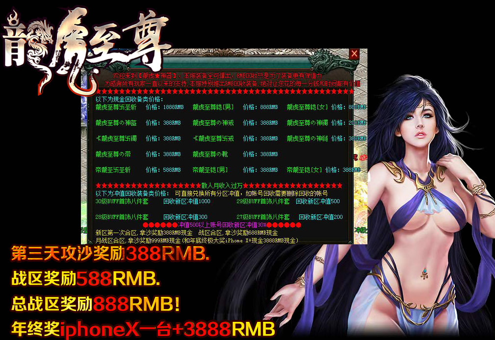 【游戏介绍】:全套元宝首杀,仙灵首杀,装备首杀,超高装备回收!