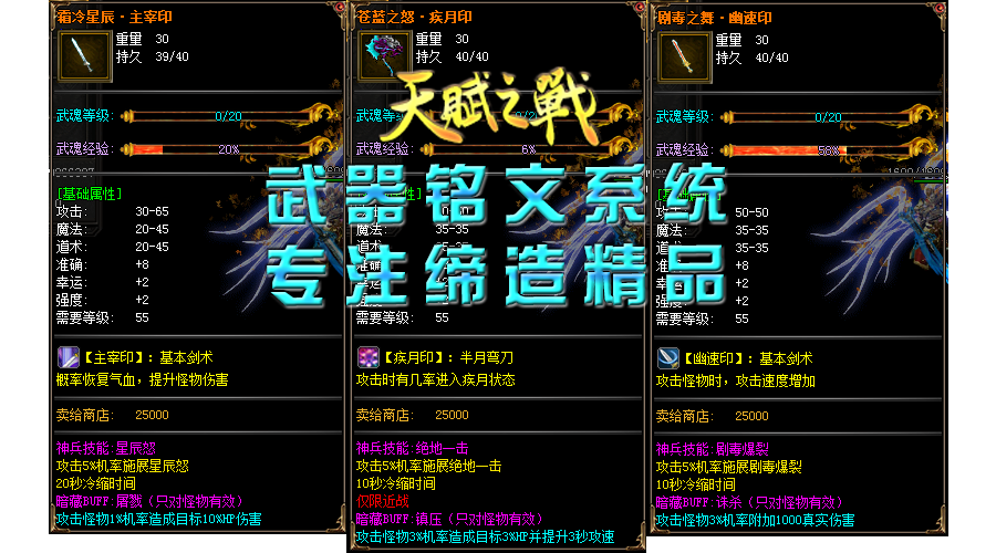 | 内容介绍:玩家通过挖矿分解获得职业铭文石,然后给武器铭刻铭文效果.支持无限铭刻,高级武器能刻双铭文 |