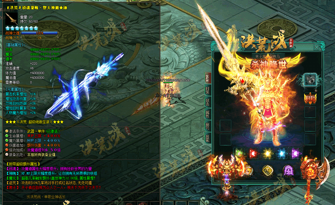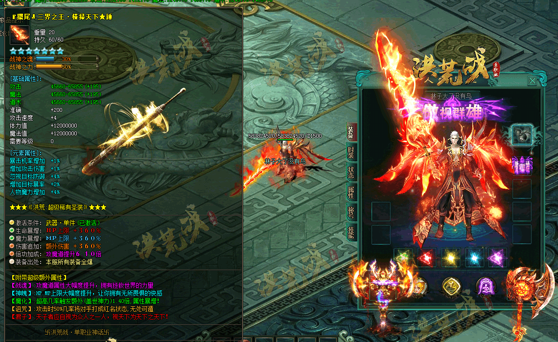 3:所有地图免费进入,所有装备0级佩戴,海量BOSS,神器·全面更新多套神力装,属性平衡,PK激情·