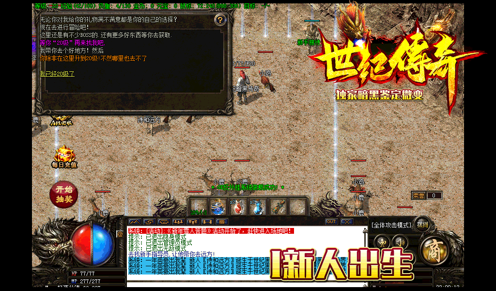 [*]新手出生赠送新手三件套(收拾、衣服+武器)新手装备,升级到25级会转到密码房输入仓库二级保护码,然后自动传送到土城。土城设有激情泡点NPC,但为了维护所有玩家公平游戏,新区一线2个小时内无法进入泡点,属于进初级地图手动升级。同时,新区开放10分钟前后,就会提示[雪域地图有奖答题,奖励丰厚,修为值、技能书等]。