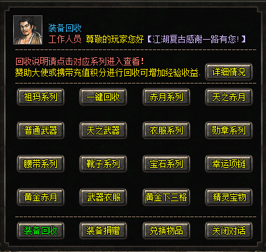 4、装备回收:通过命令[@服务]或者点击药品快捷栏的[金钻服务]按钮实现在线回收,可获得丰厚经验和元宝。