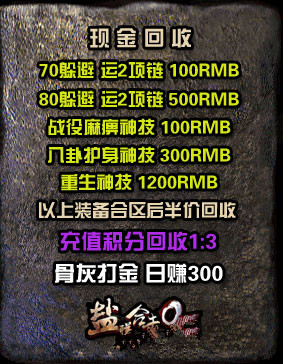 ·>>【游戏特色】:本服所有装备全靠打,极品上限+7,元宝装备保值,骨灰天堂,散人必选! |