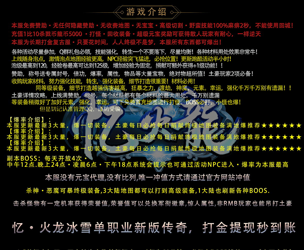 【游戏介绍】:<本服为长期打金复古服·只要花时间,人人终极不是梦,本服所有东西都可爆出!