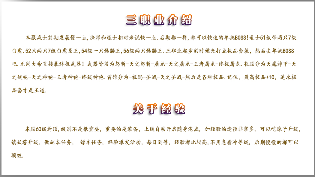 所有地图0等级进入,地图超多,怪物刷新快,元宝不能购买任何装备,没有无怪可打情况