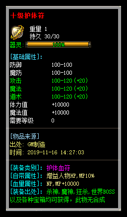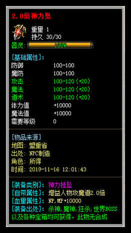 VIP10赞助礼包需要10000元宝激活(送:2.0倍神力坠 并且享受进入高级地图权限,杀怪爆率增加100%)