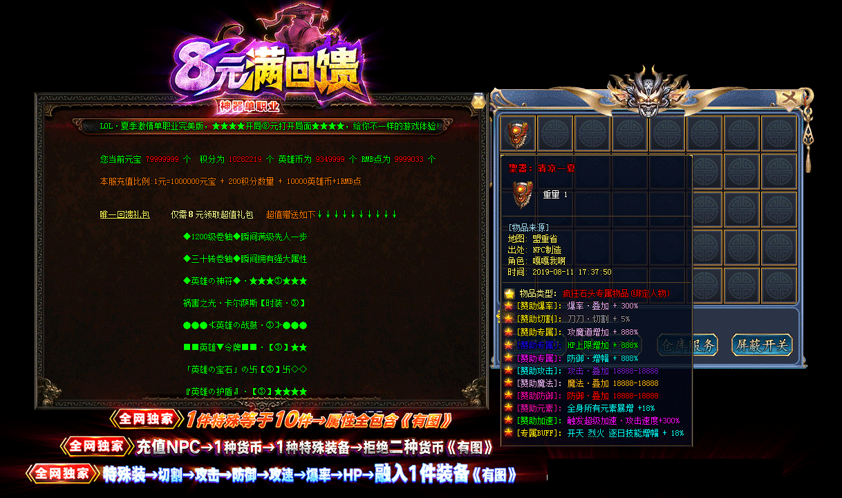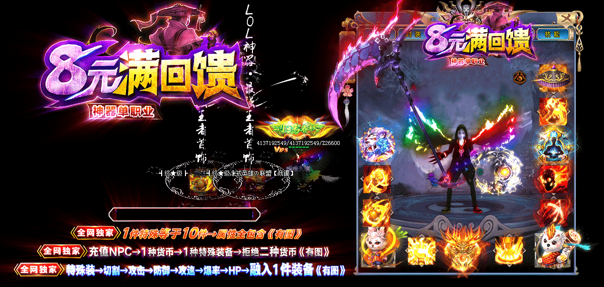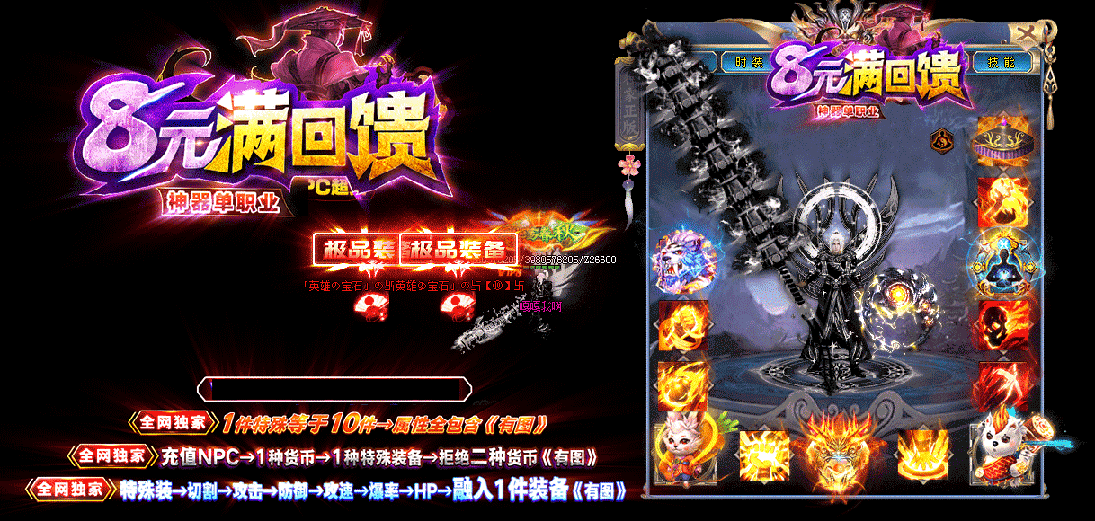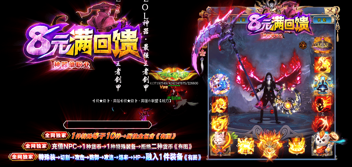 游戏介绍:8元领回馈!上线先装B!全服1个充值NPC!拒绝2种货币! 8元▄刀刀光柱