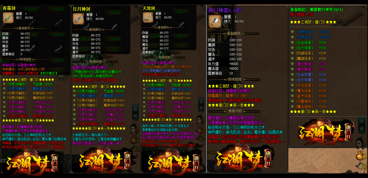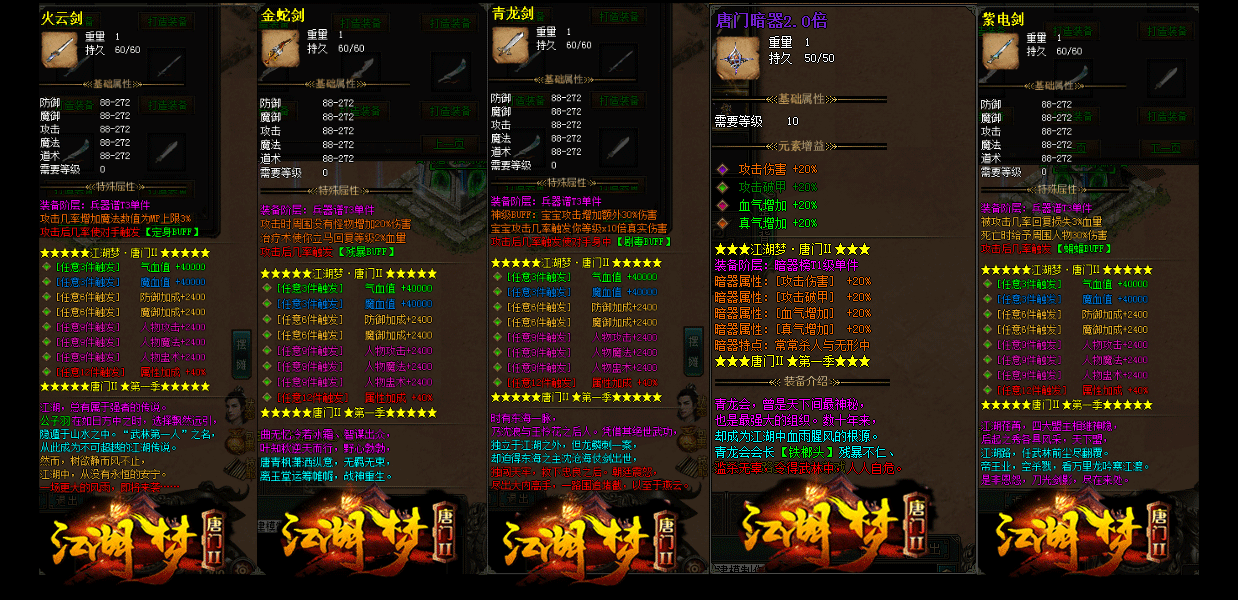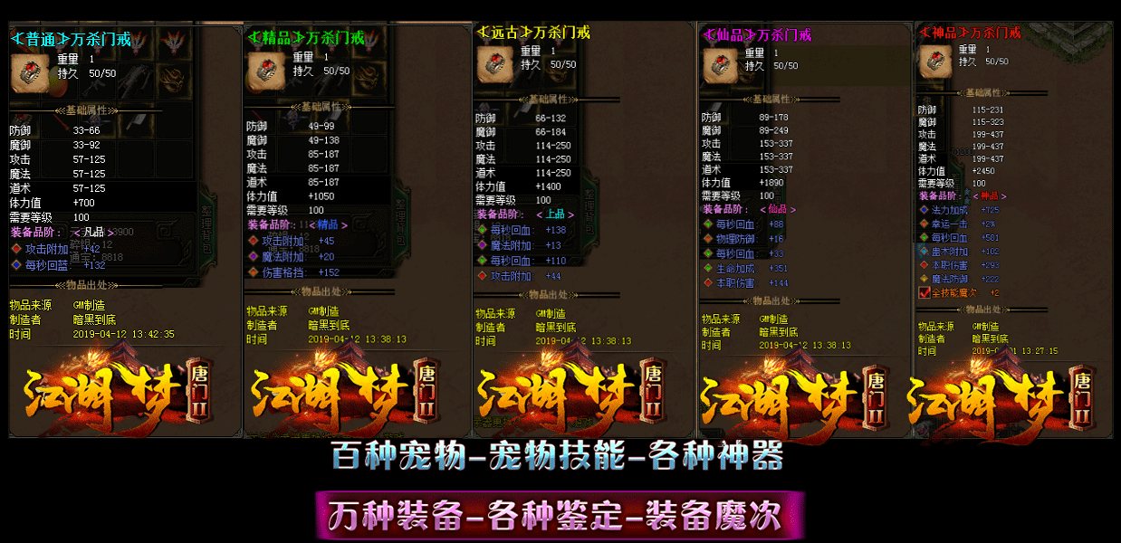 - 装备介绍:本服装备(等级)分别是:普通→精品→远古→仙品→神品→神器!